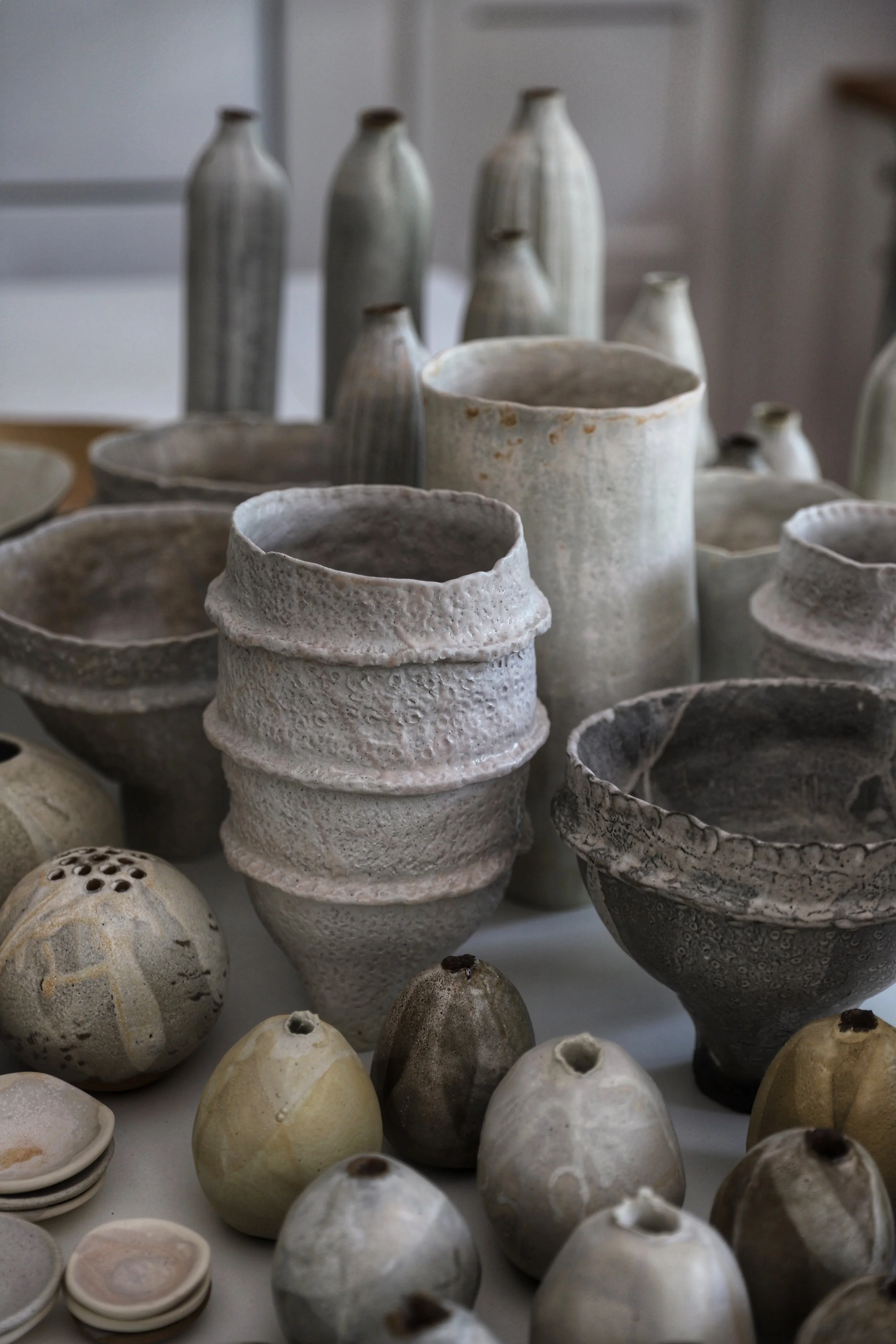Natalie's creative process incorporates hand-building techniques, including coiling, carving, and slab work with various stoneware clay bodies. Her glazes are meticulously layered, and multiple firings are conducted to achieve highly individualised results. The end products reflect both oceanic and natural hues, with textures that beckon to be touched. Natalie's work reflects a deep connection to the ocean, capturing its fluidity, textures and colours.